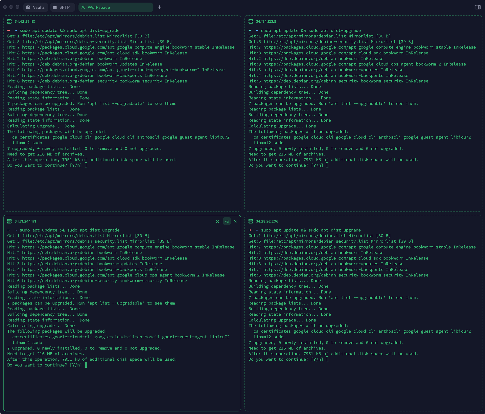 最近发现Termius的广播输入(Broadcast Input)功能可以将我的键盘输入同时发送到多个终端。在分屏视图中打开多个 SSH 连接,启用广播输入后,输入一次命令就能在所有服务器上同时执行,并显示运行结果。