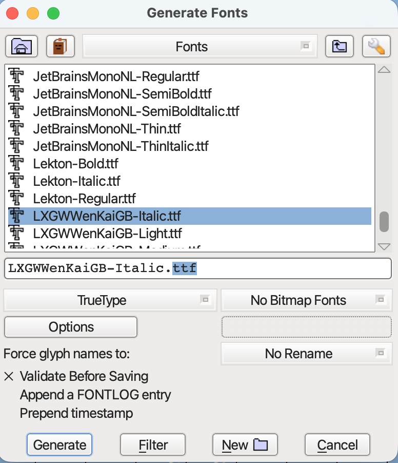 第4步:通过菜单File → Generate Fonts将字体保存到 /Users/<username>/Library/Fonts/LXGWWenKaiGB-Italic.ttf