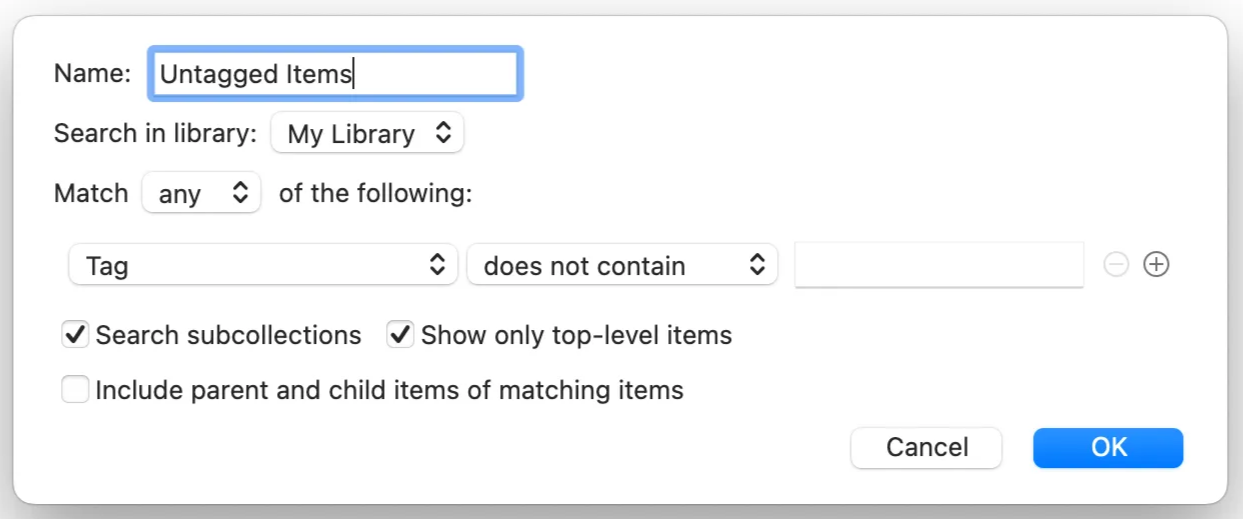 创建Saved Search(保存的搜索)是一个实用的功能,可以帮助你快速找到所有无标签的文献。这样可以确保你的文献库管理始终保持完整和有序:
