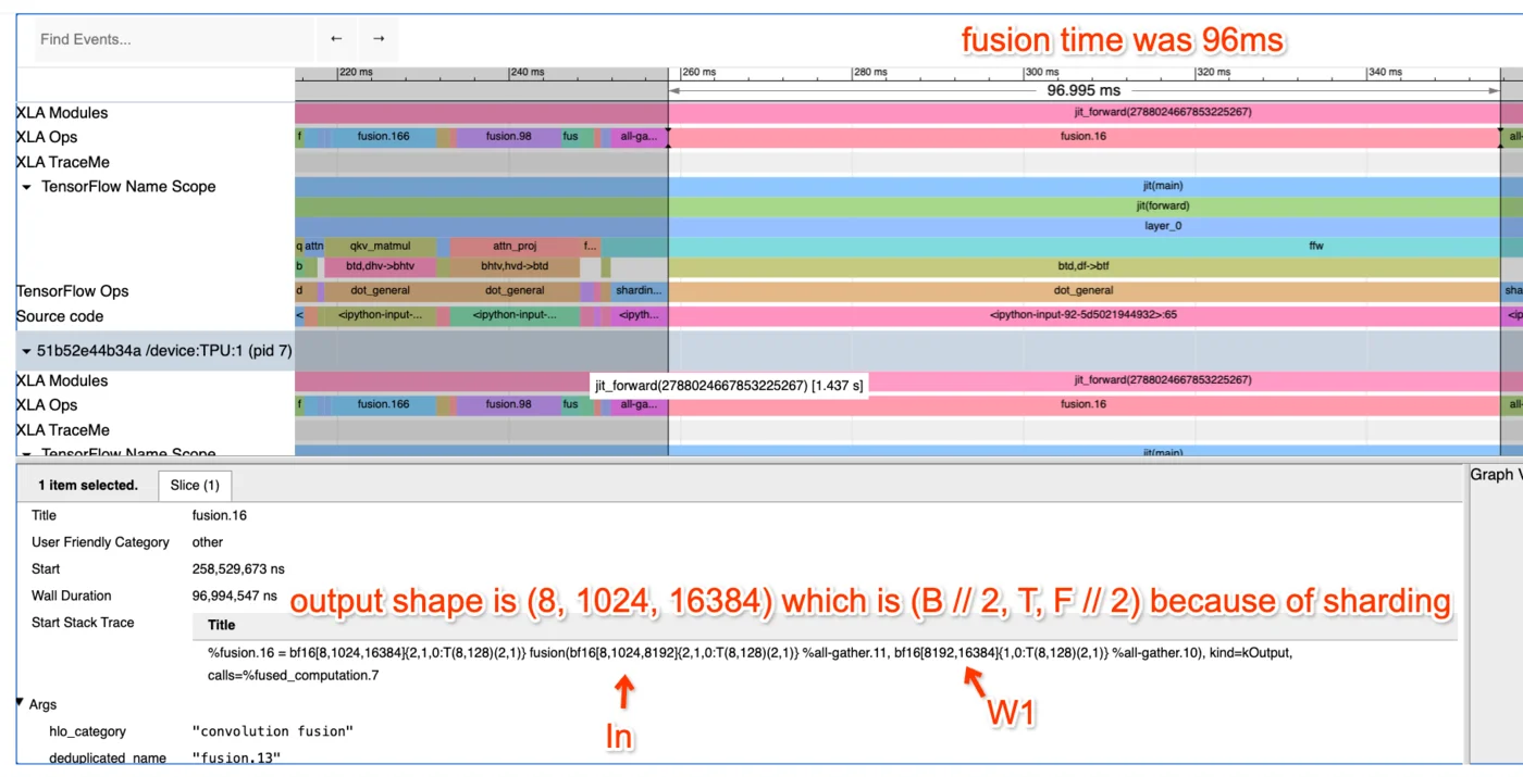 jax.jit,会发生一些事情。分析一下它决定进行什么通信。这需要多长时间?你会注意到上述方法的一个问题是,它可能会在本地收集完整的激活集A,即AllGather_X([S_X, D_Y])。这不仅在通信方面代价高昂,如果我们无法在本地适配完整的激活集,在内存方面也极其昂贵。使用