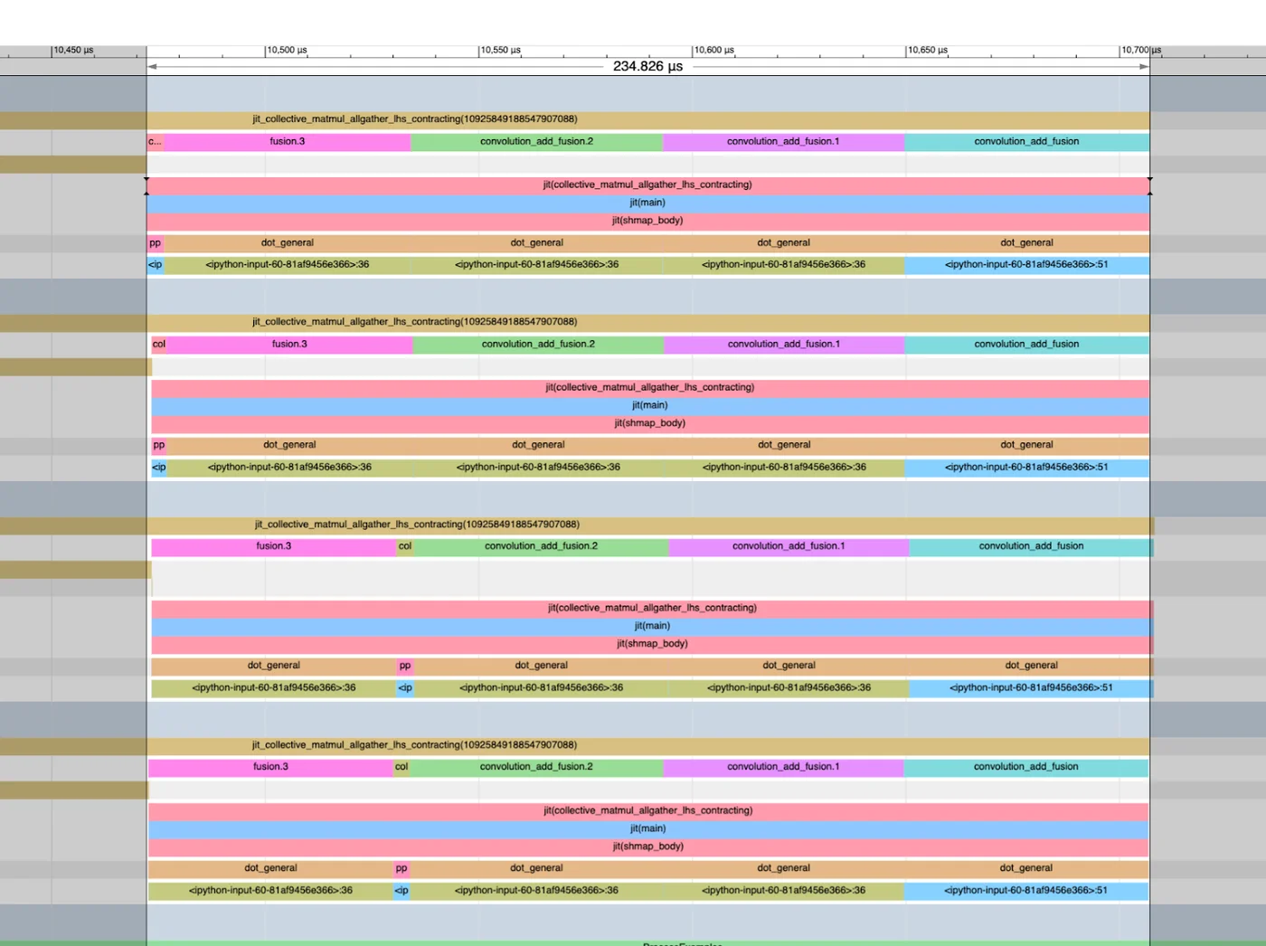 值得注意的是,在收缩维度上没有分片的矩阵乘法时间是224微秒,所以我们非常接近未分片的基准。这是一个很好的例子,说明了你可能会进行何种性能工程来提高TPU利用率。有关shard_map的更多示例,这篇笔记很棒。