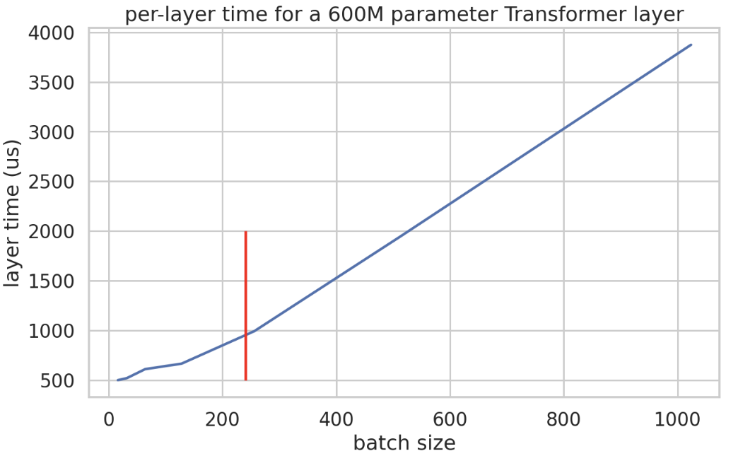 💡 要点:对于大多数TPU上的bfloat16矩阵乘法,要使其受计算限制,我们需要使我们的本地批量大小(以token为单位)大于240。